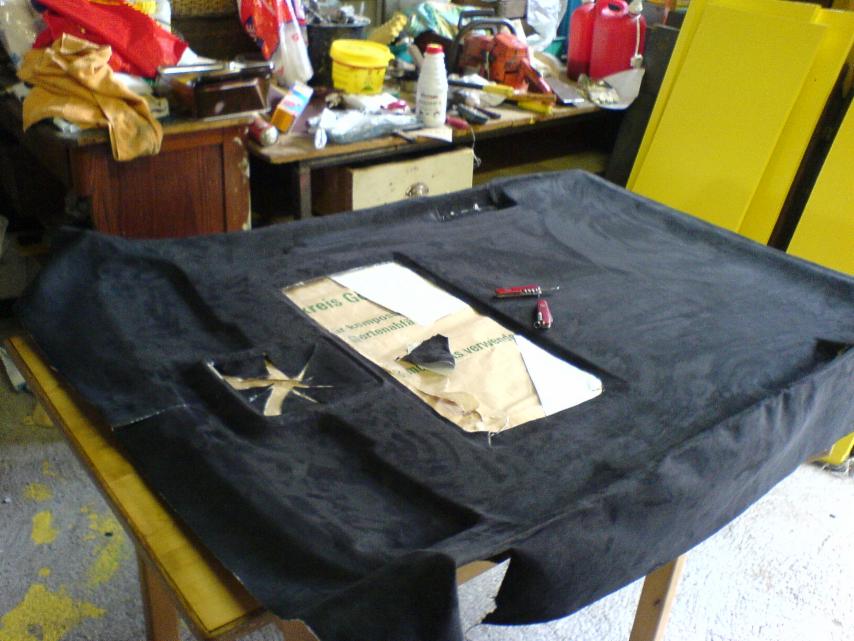 Den Pappkarton dann vom orginal Himmelstoff befreien und die darunterliegende Schaumstoffschicht ( oder was davon übrig ist ) entfernen.